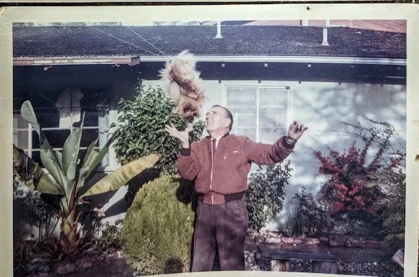 And so, this morning, I gifted myself with an hour to research a photo that’s been tacked to my bulletin board for years with the intention of writing some sort of essay/poem/story about it. It’s a 1963 photo of my great-grandfather’s friend Buddy Hughes from their vaudeville days together—and Buddy’s got a Pomeranian balanced on one front paw…on his thumb.