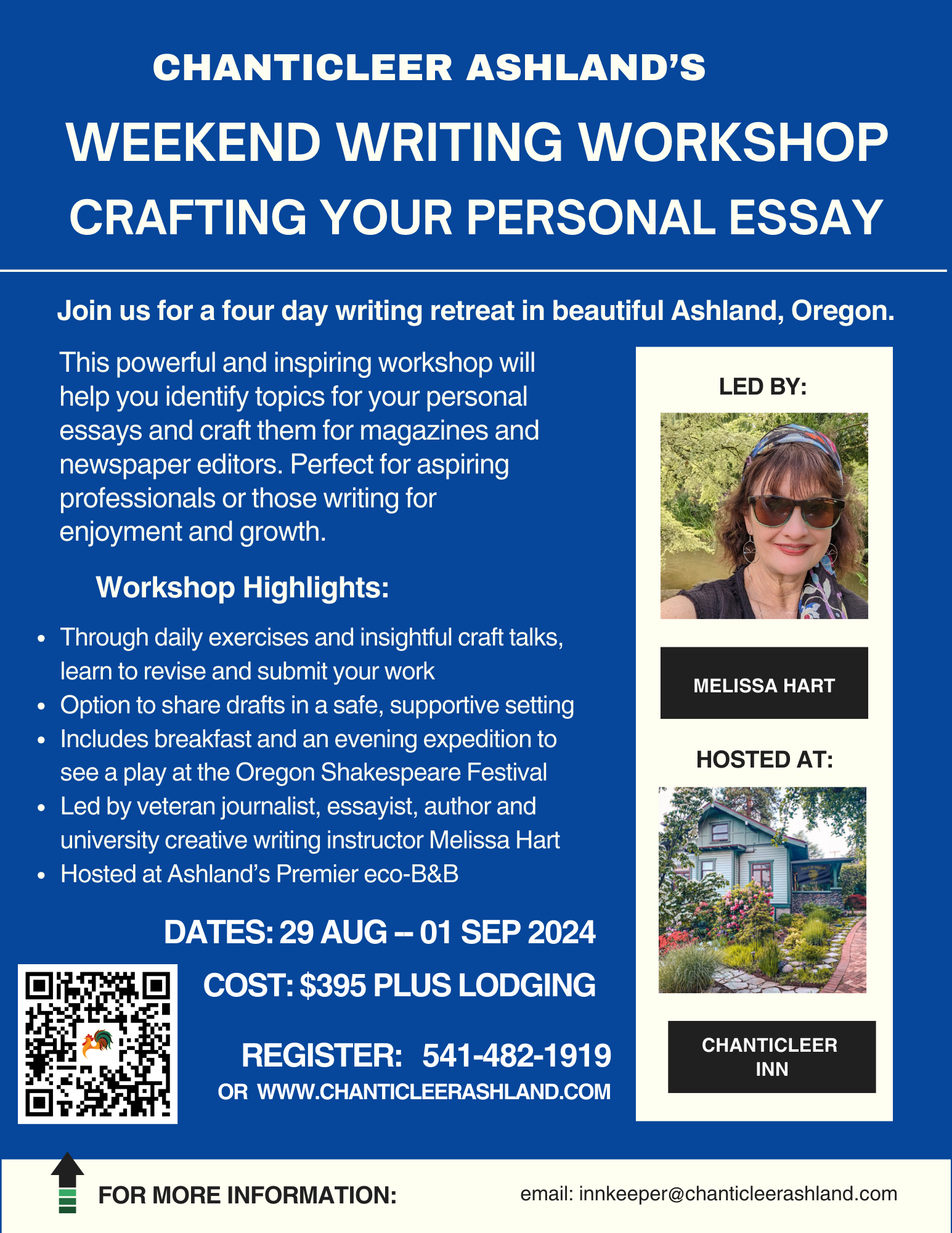 August 29th-Sept. 1st, 2024—I’m thrilled to be partnering with Chanticleer Inn in Ashland, Oregon to teach a four-day workshop on personal essay writing. We’ll share writing and meals and a play at Oregon Shakespeare Festival . . . it’s going to be a lovely, inspiring long weekend full of new, exciting friendships and writing!